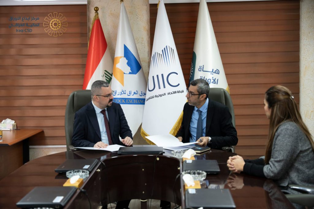 تم توقيع اتفاقية (ايداع وتسجيل سجل المساهمين) بين مركز إيداع الأوراق المالية العراقي ICSD متمثلا بالسيد (أمير صباح سعيد/ مدير مركز إيداع الأوراق المالية العراقي) وبحضور السيد ( علي جمال أمين/ المدير التنفيذي لسوق العراق للأوراق المالية) ، مع شركة الاتحاد الدولية للتأمين منصة – OTC متمثلا بالسيد (أياد محمد ناجي/ المدير المفوض) في يوم الثلاثاء الموافق 2026/3/03. برأسمال الشركة البالغ (5,000,000,000) دينار عراقي .